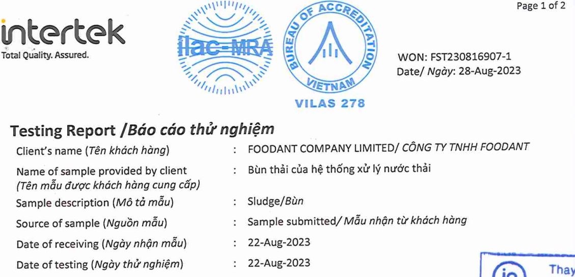 KẾT QUẢ PHÂN TÍCH BÙN THẢI THÁNG 08